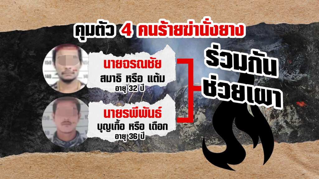 คนร้ายที่ก่อเหตุเผานั่งยาง 3 ศพ และฆ่าฝังดิน 1 ศพ ในสวนปาล์มน้ำมัน ต.กะลาเส อ.สิเกา จ.ตรัง ทนแรงกดดันจากเจ้าหน้าที่ไม่ไหว ล่าสุดยอมให้เจ้าหน้าที่ควบคุมตัว เพราะกลัวจะถูกวิสามัญ โดย 2 คนแรกคือ นายศุภกรณ์ หรือ บิน หัวหน้าแก๊ง กับนายจรณชัย หรือ แต้ม ตำรวจควบคุมตัวได้ช่วงเช้ามืดวันนี้ ส่วนอีก 2 คนคือ นายปิยศักดิ์ หรือ แจ็ค และนายรพีพันธ์ หรือ เทือก ตำรวจเข้าควบคุมตัวได้ช่วงเย็นที่ผ่านมา ขณะที่หนีไปกบดานอยู่ในป่าบ้านถ้ำน้ำผุด อ.เมืองตรัง ซึ่งคือบ้านเกิดของนายแจ็ค หนึ่งในผู้ต้องหา