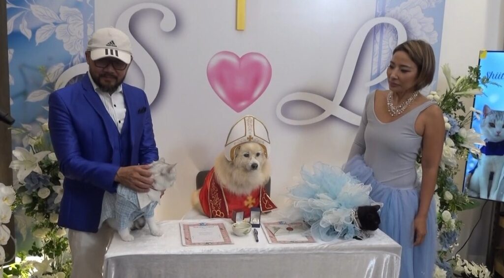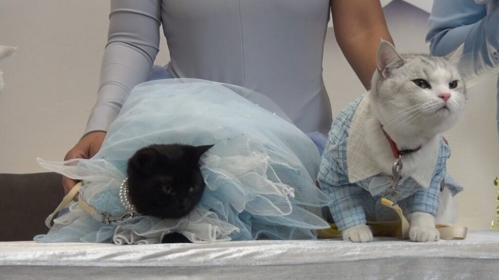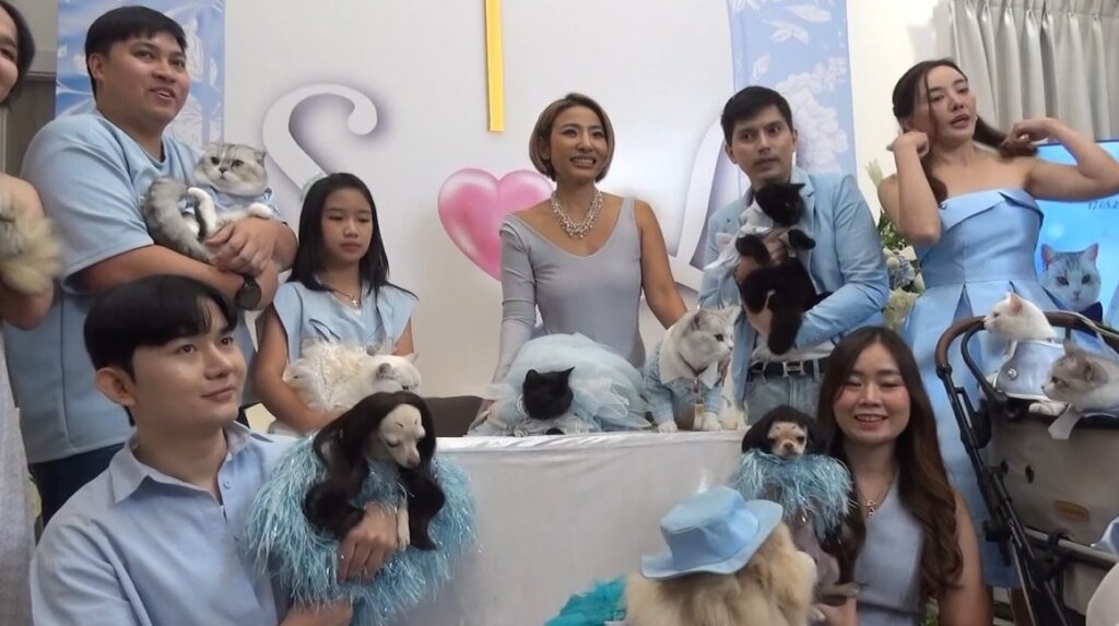 งานแต่งเป็นธีมสีฟ้า-ขาว ทาสแมว รวมถึงแมว สุนัข และบรรดาอินฟูลเอนเซอร์ ร่วมเป็นสักขีพยาน และชมพรีเซนเทชั่นบอกเล่าความเป็นมาของบ่าว-สาว และร่วมพิธีสวมแหวน โดยมีพี่มาร์ช สุนัขแสนรู้พันธุ์เจแปนนิส สปิตซ์ ทำหน้าที่เป็นบาทหลวง และนำจดทะเบียนสมรสด้วยการใช้ผงมะรุมประทับรอยเท้าแมวบ่าว-สาวบนใบทะเบียนสมรส ก่อนมีการถ่ายภาพหมู่ร่วมกัน