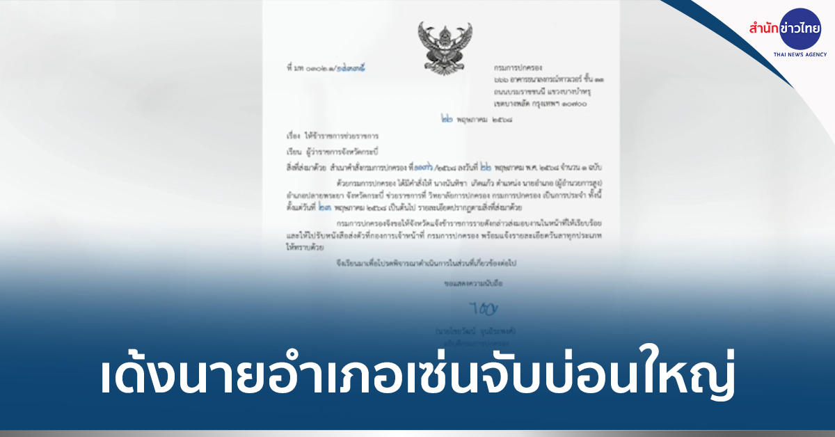 กระบี่ 23 พ.ค.- อธิบดีกรมการปกครอง ลงนามสั่งเด้งนายอำเภอปลายพระยา เซ่นจับบ่อนใหญ่กลางสวนปาล์ม