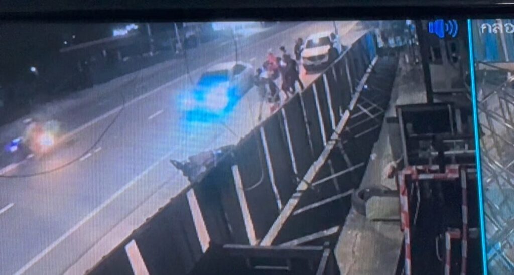 กล้องวงจรปิดจับภาพเหตุการณ์ รถจักรยานยนต์คันหนึ่งขับหนีมาด้วยความเร็วก่อนจะเสียหลักชนกับรถเก๋ง SUV สีขาวที่จอดอยู่ข้างทางอย่างจัง จนร่างกระเด็นเข้าใต้ท้องรถ ก่อนจะมีกลุ่มวัยรุ่น 2 ฝ่ายอาวุธครบมือ ลงมาทะเลาะวิวาทกัน จนชุลมุน และรถเก๋งอีกคันที่ถอยกลับมาด้วยความเร็ว พุ่งชนกลุ่มที่กำลังมีเรื่องจนกระเด็นไปกระแทกรั้วบ้านชาวบ้านเสียหาย