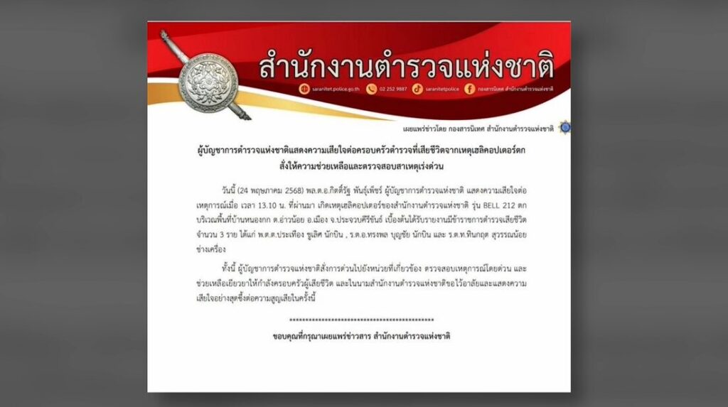 ด้าน เฟซบุ๊ก เพจสำนักงานตำรวจแห่งชาติ โพสต์ภาพข้อความจาก พล.ต.อ.กิตติ์รัฐ พันธุ์เพ็ชร์ ผู้บัญชาการตำรวจแห่งชาติ ที่แสดงความเสียใจต่อครอบครัวตำรวจที่เสียชีวิตจากเหตุเฮลิคอปเตอร์ตก โดย ผบ.ตร.ได้สั่งด่วนไปยังหน่วยงานที่เกี่ยวข้อง ตรวจสอบสาเหตุเร่งด่วน และช่วยเหลือเยียวยาครอบครัวผู้เสียชีวิต