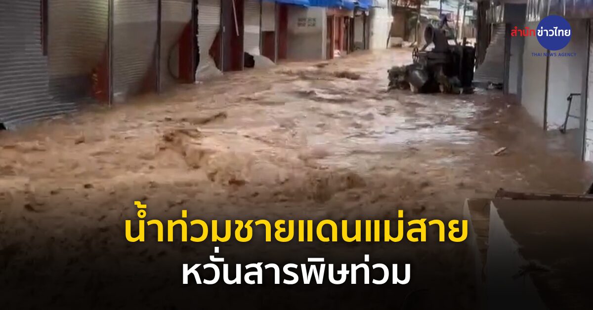 เชียงราย 24 เม.ย. – เพิ่งเริ่มต้นฤดูฝน แต่ฝนตกหนักในเมียนมา ทำให้แม่น้ำสายไหลทะลักท่วมชายแดนแม่สาย ที่เชียงราย ชาวบ้านขนของหนีน้ำอลหม่าน หวั่นซ้ำรอยน้ำท่วมใหญ่ปีที่แล้ว และยังต้องกังวลกับสารพิษปนเปื้อนมากับน้ำท่วมด้วย.-สำนักข่าวไทย