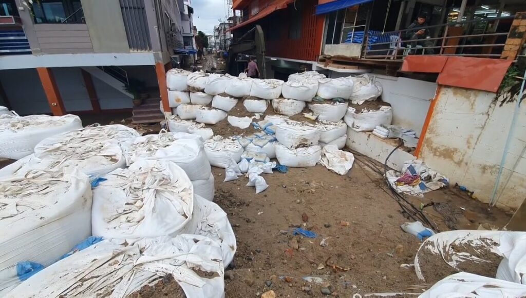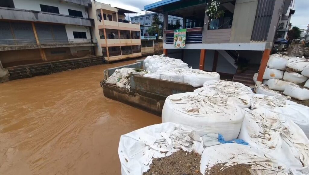 ส่วนที่อำเภอแม่สาย จังหวัดเชียงราย ลุ้นน้ำท่วมกันทั้งคืน หลังมีประกาศเตือนมวลน้ำก้อนใหญ่ ไหลมาจากเมียนมา จะถึงแม่สายเมื่อคืน อาสาสมัครจัดการภัยพิบัติ มูลนิธิเพื่อนพึ่ง (ภา) ร่วมกับเทศบาลเวียงพางคำ หน่วยเฉพาะกิจทัพเจ้าตาก กองกำลังผาเมือง กรมชลประทาน ช่วยกันกรอกถุงบิ๊กแบ็ก เตรียมติดตั้งเครื่องสูบน้ำ 14 นิ้ว ในพื้นที่บ้านถ้ำผาจม เพื่อรับมือหากเกิดน้ำท่วมฉับพลัน