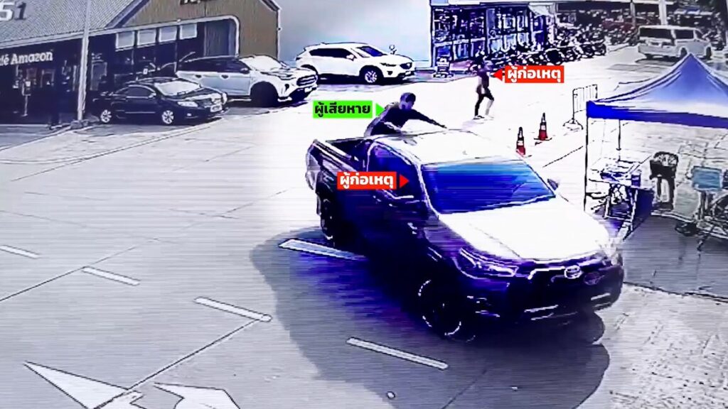 กล้องวงจรปิด ภายในปั๊มน้ำมันในพื้นที่อำเภอบางพลี จังหวัดสมุทรปราการ บันทึกภาพขณะคนร้าย 2 คน สวมเสื้อสีเหลืองและดำ อาศัยจังหวะเผลอ ขับรถกระบะที่มีภรรยาผู้เสียหายท้อง 8 เดือน ออกไป ก่อนที่ตัวผู้เสียหายจะรีบวิ่งออกมาจากร้าน กระโดดขึ้นท้ายกระบะทันที