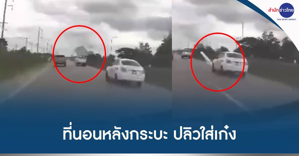 กระบะคันหน้า คาดว่าจะรัดที่นอนกับตัวรถไม่แน่น หรือไม่ได้มัดเลย แถมไม่พอขับเร่งความเร็ว แซงขึ้นไปด้านหน้าอีก จนที่นอนปลิวมาใส่รถเก๋งที่ขับตามมาด้านหลัง โชคดีที่ไม่เกิดอุบัติเหตุรนแรง