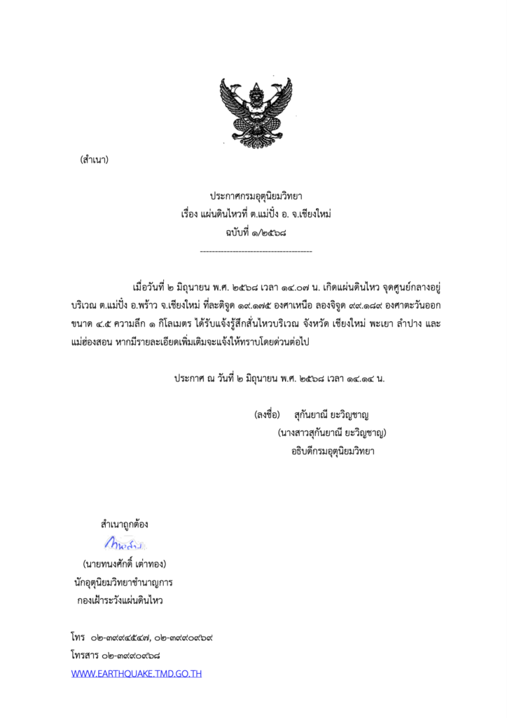 ประกาศกรมอุตุนิยมวิทยา เรื่อง แผ่นดินไหวที่ ต.แม่ปั๋ง อ.พร้าว จ.เชียงใหม่ ฉบับที่ 1/2568