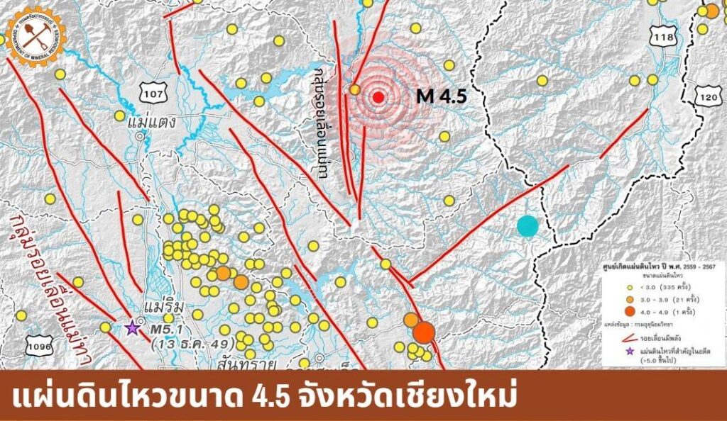 เชียงใหม่ 2 มิ.ย.- ระทึก! แผ่นดินไหว ต.แม่ปั๋ง อ.พร้าว จ.เชียงใหม่ ขนาด 4.5 ลึก 1 กม. ประชาชนแจ้งรู้สึกสั่นไหว 4 จังหวัด สาเหตุเกิดจากกลุ่มรอยเลื่อนแม่ทา