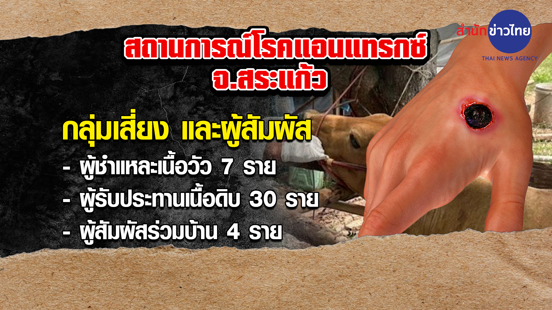 สระแก้ว 3 มิ.ย.- สระแก้วลุยสอบสวนโรค หลังพบติดเชื้อแอนแทรกซ์รายแรกของจังหวัด เฝ้าระวังกลุ่มเสี่ยง มีผู้ชำแหละ 7 ราย กินเนื้อดิบ 30 ราย เตรียมแผนฉีดวัคซีนและให้ยาปฏิชีวนะ
