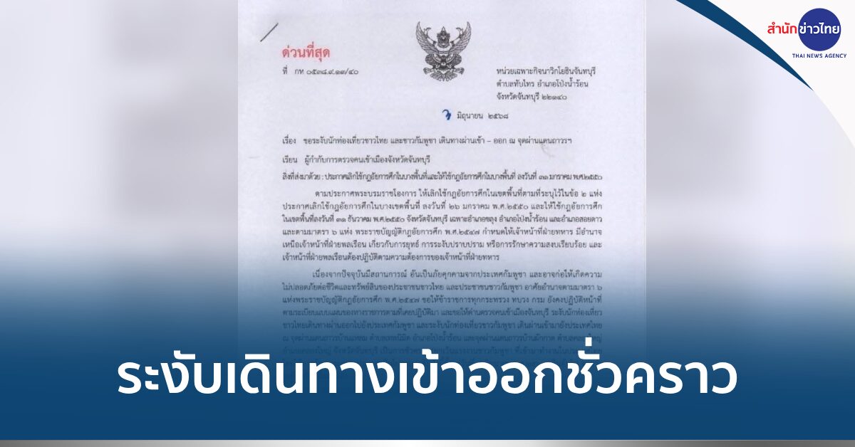 เนื่องจากปัจจุบันมีสถานการณ์อันเป็นภัยคุกคามจากประเทศกัมพูชา และอาจก่อให้เกิดความไม่ปลอดภัยต่อชีวิตและทรัพย์สินของประชาชนชาวไทย และประชาชนชาวกัมพูชา อาศัยอำนาจตามมาตรา 5 แห่งพระราชบัญญัติกฎอัยการศึก 2547 ขอให้ข้าราชการทุกกระทรวง ทบวง กรม ยังคงปฏิบัติหน้าที่ ตามระเบียบแบบแผนของทางราชการตามที่เคยปฏิบัติมา และขอให้ด่านตรวจคนเข้าเมืองจันทบุรี ระงับนักท่องเที่ยวชาวไทยเดินทางผ่านออกไปยังประเทศกัมพูชา และระงับนักท่องเที่ยวชาวกัมพูชา เดินผ่านเข้ามายังประเทศไทย ณ จุดผ่านแดนถาวรบ้านแหลม ตำบลเทพนิมิต อำเภอโป่งน้ำร้อน และจุดผ่านแดนถาวรบ้านผักกาด ตำบลคลองใหญ่ อำเภอคลองใหญ่ จังหวัดจันทบุรี เป็นการชั่วคราว (ยกเว้นแรงงานชาวกัมพูชา ที่เข้ามาทำงานในประเทศไทย โดยให้การค้าขายระหว่างประเทศเป็นไปตามปกติ)