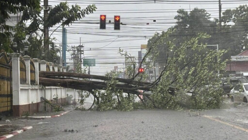 เมื่อวานนี้ (8 มิ.ย.) เวลาประมาณ 16.30 น. เกิดเหตุฝนตก ลมแรง และฟ้าคะนองในพื้นที่อำเภอเมืองเลย จ.เลย โดยเฉพาะในเขตเทศบาลเมืองเลย ทำให้มีต้นพญาสัตบรรณขนาดใหญ่ ภายในบริเวณรั้วศูนย์ราชการจังหวัดเลย โค่นล้มลงทับถนน เกือบทับรถประชาชนที่ขับมาจอดติดไฟแดงสี่แยก กล้องจากหน้ารถบันทึกภาพเหตุการณ์นาทีระทึกไว้อย่างชัดเจน รถที่จอดอยู่ทั้งสองคัน รอดพ้นอันตรายอย่างหวุดหวิด