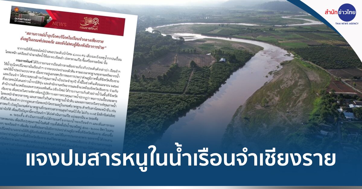 เชียงราย 9 มิ.ย. – กรมราชทัณฑ์ แจงข่าวสารหนู-สารตะกั่ว จากน้ำกก ลามเข้าไปปนเปื้อนในเรือนจำกลางเชียงราย หวั่นนักโทษ 4,000 คน เสี่ยงมะเร็ง ยืนยันน้ำในเรือนจำฯ อยู่ในเกณฑ์ปลอดภัย
