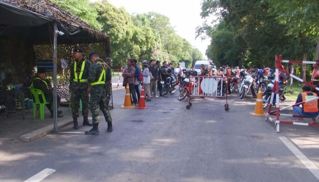 ที่เห็นต่อแถวยาวเหยียด เข้าคิวรอตั้งแต่เมื่อวานคือ รถบรรทุกที่จะเข้าไปซื้อมันสำปะหลังในฝั่งกัมพูชา คนกัมพูชาที่กลับประเทศวันนี้มีทั้งกลุ่มคนที่เข้าๆ ออกๆ ไปทำธุระส่วนตัวเล็กน้อย และกลุ่มที่กลับไปตั้งหลักรอดูสถานการณ์ จึงเห็นสัมภาระจำพวกเครื่องใช้ส่วนตัว ซึ่งเจ้าหน้าที่เน้นตรวจค้นสิ่งของผิดกฎหมายและจำพวกอุปกรณ์ก่อสร้างที่ห้ามนำออกราชอาณาจักรไทย แม้แต่ไฟโซลาร์เซลล์ก็ถูกยึดไว้ เมื่อผ่านจุดตรวจเพื่อความมั่นคงชายแดนของกองกำลังสุรนารีได้แล้ว