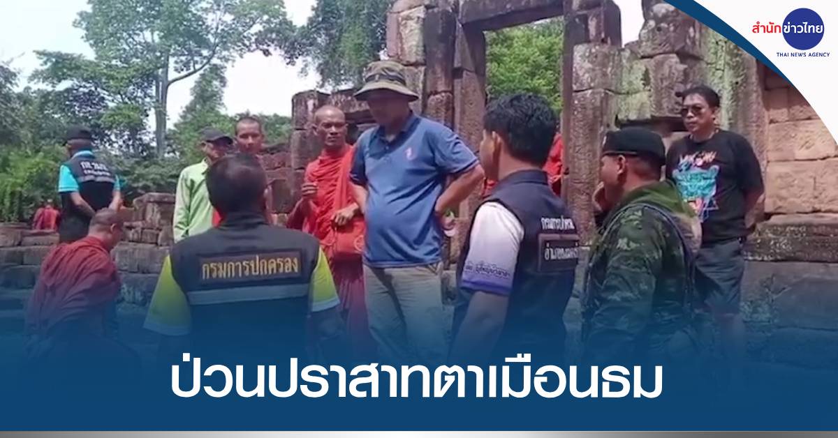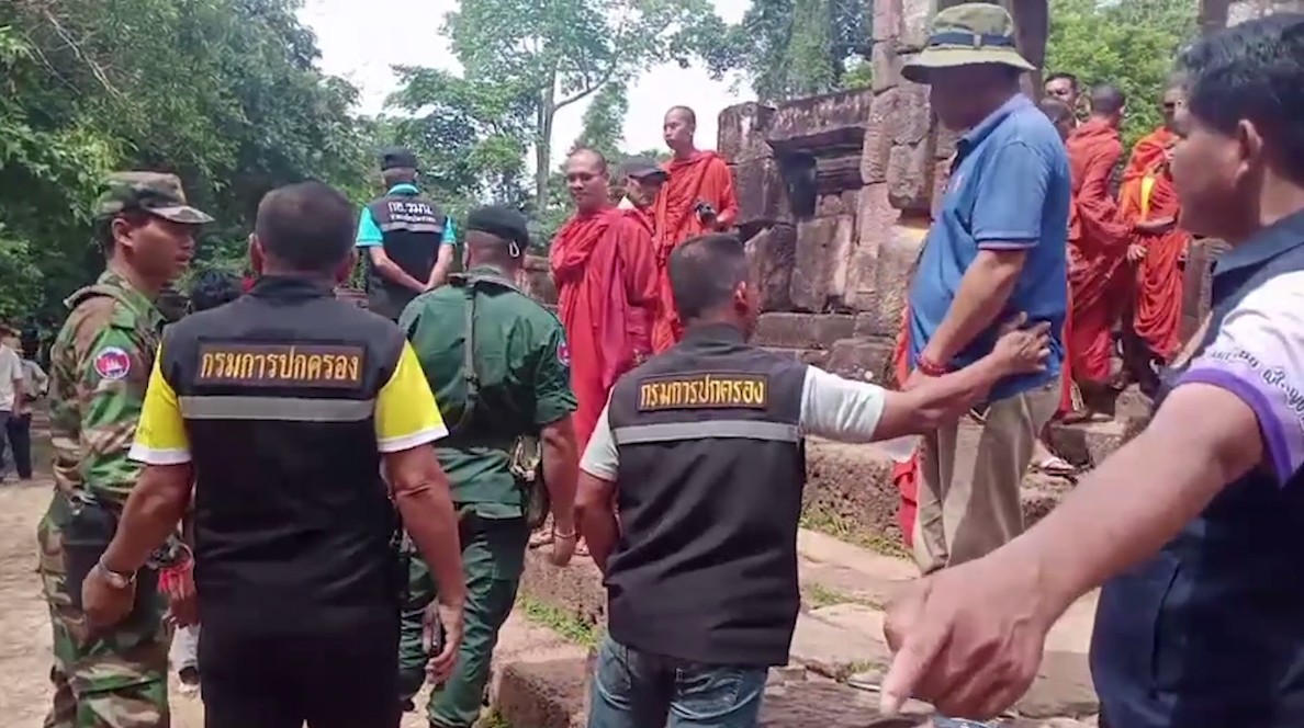 นี่เป็นภาพขณะเจ้าหน้าที่ทหารและฝ่ายปกครองของไทย เข้าชี้แจงชาวกัมพูชาและพระสงฆ์กัมพูชา ประมาณ 15 รูป ซึ่งตอนแรกทำทีเป็นนักท่องเที่ยวมาเที่ยวชมปราสาทตาเมือนธม อ.พนมดงรัก จ.สุรินทร์ ในเวลาประมาณ 10.00 น. วานนี้ (19 มิ.ย.68) แต่ต่อมากลับพากันมายืนที่จุดจีพีเอส ขวางประตูทางเข้าตัวปราสาทตาเมือนธม และพูดกับคนไทยที่มาเที่ยวชมปราสาท ในลักษณะจะไม่ให้เข้า และข้ามหลักจีพีเอสไป ทั้งที่บริเวณดังกล่าวเป็นพื้นที่ของไทยทั้งหมด