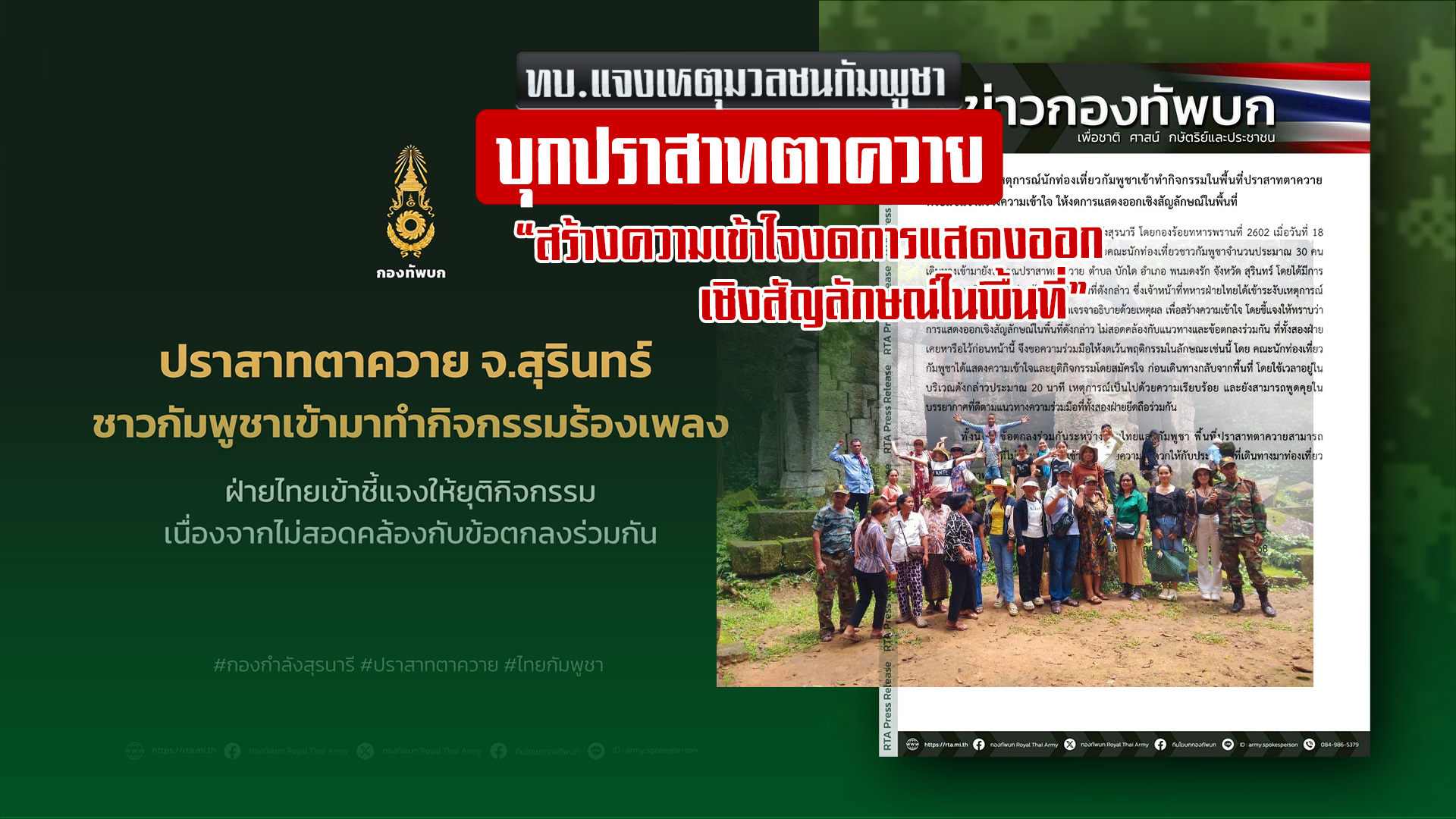 ทบ.แจงเหตุมวลชนเขมรบุกร้องเพลงบนปราสาทตาควาย จ.สุรินทร์