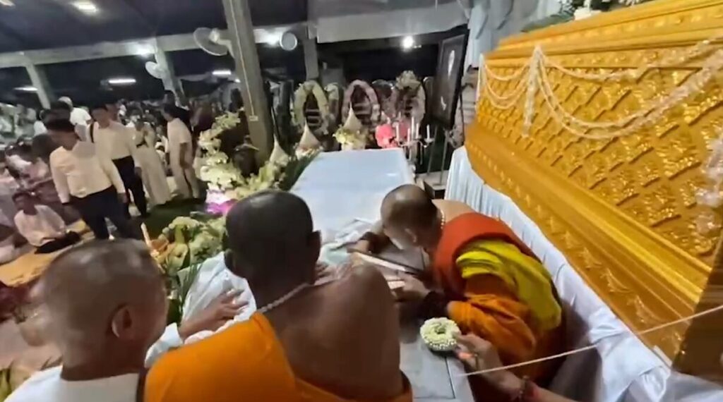 ก่อนเดินทางกลับครูบาเจ้าบุญชุ่ม ได้เข้าไปกราบร่างอดีตพระยันตระ ในโลงเย็นพร้อมพูดกับพระอนันต์ ว่าอาจารย์มองหน้าเราแล้วยิ้ม เหมือนท่านหลับอยู่ ทั้งนี้ ก่อนเดินทางกลับครูบาบุญชุ่ม ได้มอบวัตถุมงคล(ด้ายแดง)แก่พระอนันต์ อภินนฺโท สำหรับแจกให้กับผู้ที่ร่วมงานทุกคน พร้อมประกาศว่าในวันประชุมเพลิงพระอาจารย์เราจะมาอีกครั้ง และอาจจะอยู่ที่นี่สักระยะเวลาหนึ่ง โดยพุทธศาสนิกชนที่มาร่วมพิธีต่างร้องสาธุ ด้วยความดีใจ.-สำนักข่าวไทย