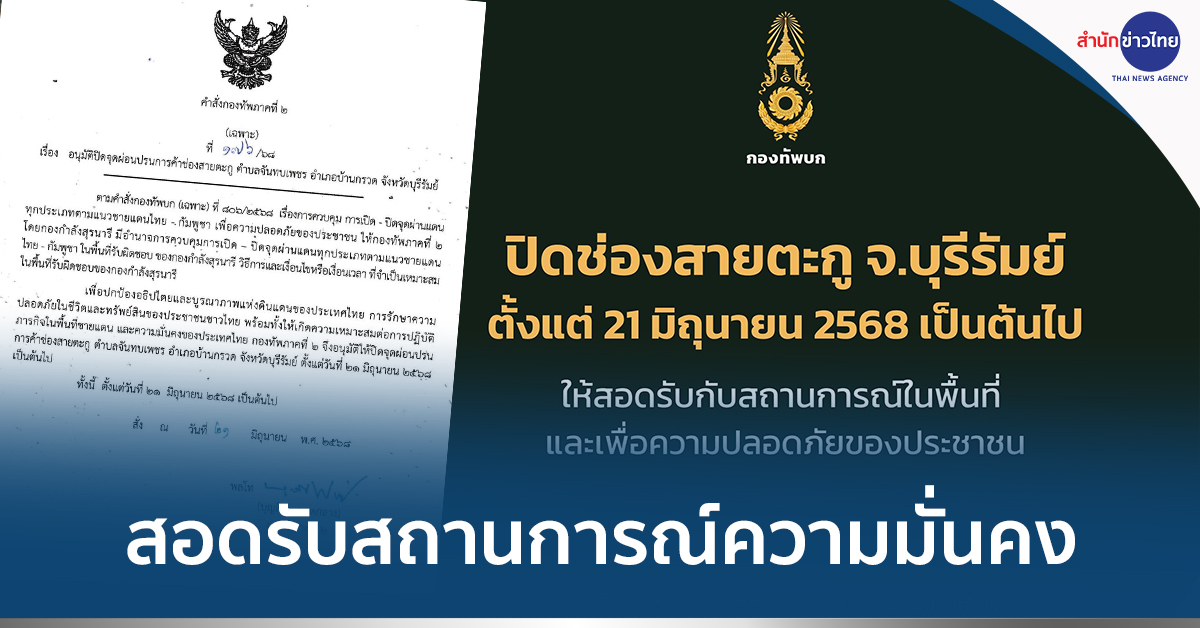 ทีมโฆษกกองทัพบก แจงกองทัพภาคที่ 2 ปิดจุดผ่อนปรนทางการค้าช่องสายตะกู จ.บุรีรัมย์ ตั้งแต่ 21 มิถุนายน 2568 เพื่อให้สอดรับกับสถานการณ์ด้านความมั่นคงในพื้นที่