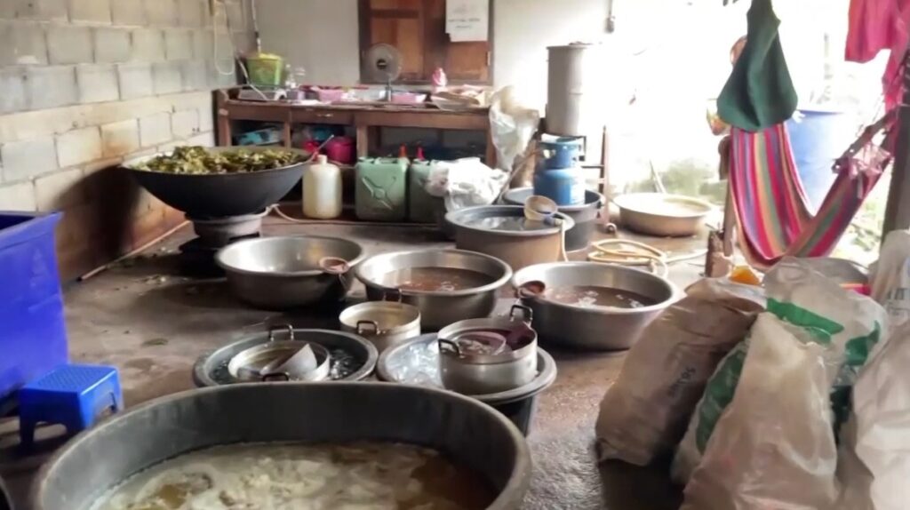 นอกจากนี้ยังมีน้ำใบกระท่อมที่เพิ่งต้มเสร็จ ทั้งที่ใส่ไว้ในกะละมังและในหม้อแช่น้ำแข็ง เพื่อเตรียมบรรจุใส่ขวด รวมถึงน้ำใบกระท่อมบรรจุใส่ขวดแช่อยู่ในลัง พร้อมส่งขนาดต่างๆ ทั้งขวด 350 มิลลิลิตร ขนาด 600 มิลลิลิตร ขนาด 830 มิลลิลิตร และขนาด 1,500 มิลลิลิต รวมน้ำใบกระท่อมที่ยึดได้ทั้งหมดประมาณ 868 ลิตร สภาพภายในโรงต้มสกปรกมาก เรียกว่าแทบจะต้มกันกลางดินกลางทราย ใช้กระทะใบบัวในการต้มใบกระท่อม เจ้าหน้าที่ยึดของกลางที่เป็นอุปกรณ์การผลิตเอาไว้ ทั้งกระทะ หม้อ กะละมัง แก๊ส หัวเร่ง ถุงชา กระบอกกรวย ยาแก้ไอ 38 ขวด บุหรี่เถื่อนอีก 27 ซอง