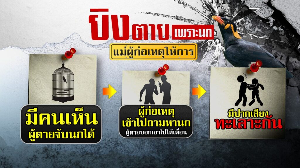 น.ส.มารี น้องสาวผู้ก่อเหตุ เล่าให้ผู้สื่อข่าวฟัง ยืนยันว่ามาจากเรื่อง “นกขุนทอง” จริง และความขัดแย้งเก่า โดยพี่ชายซื้อนกขุนทองมาคู่หนึ่งในราคา 8,000 บาท กระทั่งวันอาทิตย์ที่ผ่านมา นกได้หายไป ซึ่งก็สอดคล้องกับที่มีคนในบ้านเห็นว่าคนตายได้จับนกขุนทองทั้ง 2 ตัวไว้ พี่ชายจึงไปทวงคืน แต่อีกฝ่ายกลับไม่ยอม อ้างว่าขายต่อไปแล้วให้ไปชื้อคืน พี่ชายพยายามขอดีๆ จนกระทั่งคนตายยอมคืนนกมาให้ แต่คนตาย พูดกระทบกระทั่ง และไล่พี่ชายของตนด้วยคำพูดหยาบคาย ทำให้พี่ชายไม่พอใจ แต่ไม่อยากมีปัญหาเลยปล่อยให้เรื่องเงียบไป