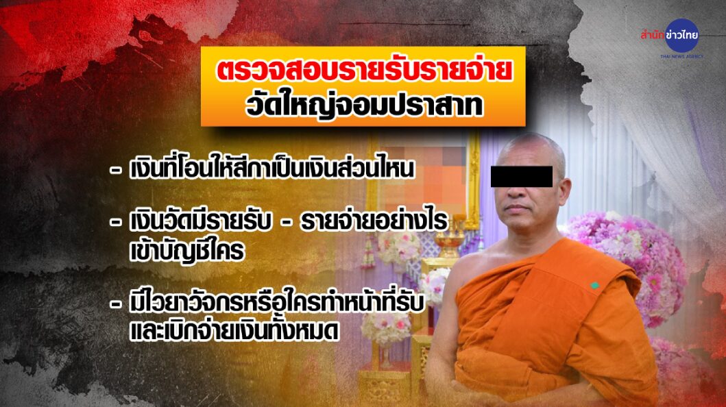 สมุทรสาคร 13 ก.ค. – เจ้าหน้าที่เข้าตรวจสอบรายรับรายจ่ายของวัดใหญ่จอมปราสาท นำมาเทียบกับเส้นเงินของของเจ้าอาวาสที่หนีไป หลังตรวจพบโอนเงินให้สีกา ก. กว่า 1 ล้านบาท