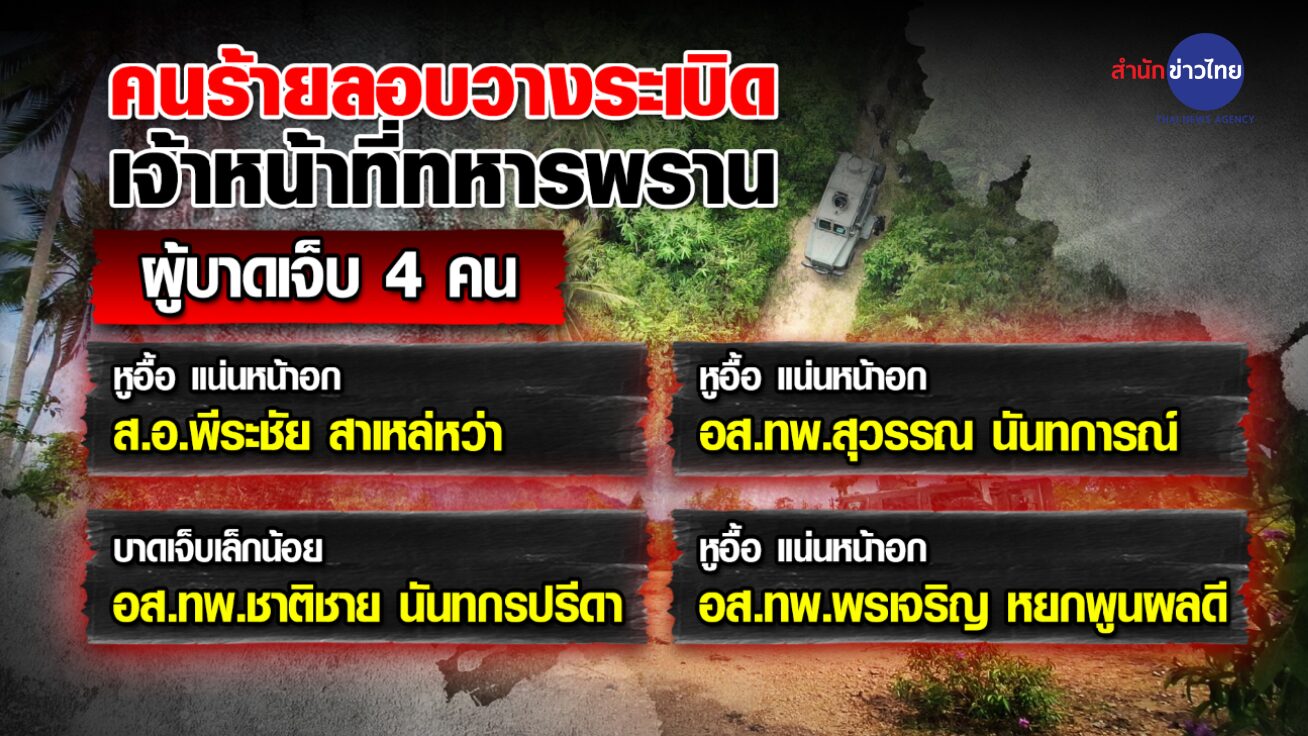 ยะลา 15 ก.ค. – คนร้ายลอบวางระเบิดทหารพราน พื้นที่ อ.บันนังสตา จ.ยะลา เบื้องต้นพบทหารพราน ชุดปฏิบัติการจรยุทธ์ บาดเจ็บ 4 นาย
