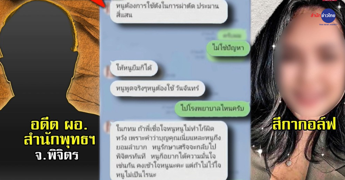 18 ก.ค. – เปิดแชต “สีกากอล์ฟ” หลอกยืมเงิน “อดีต ผอ.สำนักพุทธฯ พิจิตร” 400,000 บาท อ้างป่วย ต้องใช้เงินผ่าตัด และแลกหลักฐานกรณีอดีตเจ้าคณะจังหวัดพิจิตร มีความสัมพันธ์กับสีกากอล์ฟ
