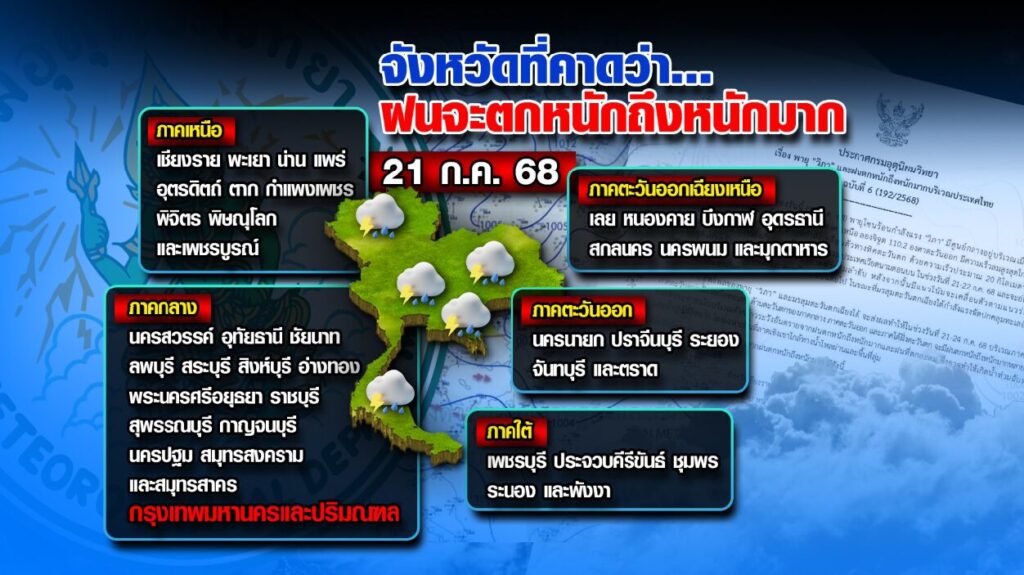 21 ก.ค. – กรมอุตุฯ เตือนทั่วไทยรับมืออิทธิพลพายุโซนร้อนกำลังแรง “วิภา” คาดขึ้นฝั่งเวียดนามตอนบนเช้าพรุ่งนี้ (22 ก.ค.) ส่งผลไทยตอนบนฝนตกหนักถึงหนักมากหลายพื้นที่