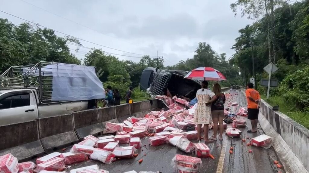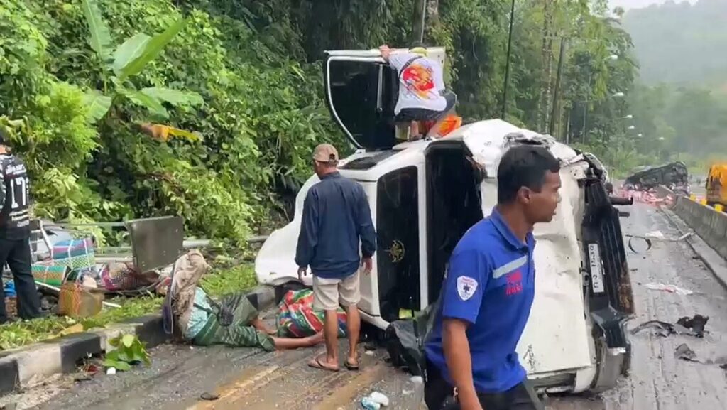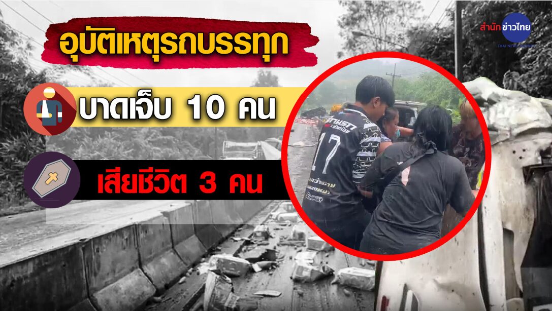 กาญจนบุรี 23 ก.ค. – 10 ล้อบรรทุกสินค้าเบรกแตก ไหลชนรถกระบะขนแรงงานเมียนมา ทางลงเขาเนินยาว ก่อนเข้า อ.สังขละบุรี เสียชีวิต 3 เจ็บกว่า 10 ราย