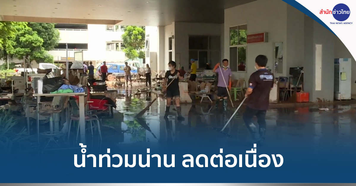 อีกจุดหนึ่งที่ได้รับความเสียหายอย่างหนักคือที่โรงพยาบาลน่านที่ถูกน้ำท่วมสูงเต็มพื้นที่ 40 ไร่ บางจุดท่วมเกือบมิดหัว ตอนนี้น้ำลดแล้ว แต่ตามอาคารต่างๆ น้ำทะลักท่วมยาเวชภัณฑ์และอุปกรณ์การแพทย์ได้รับความเสียหาย แต่ผู้ป่วยใน ราว 3 ร้อยคน ยังปลอดภัย คุณหมอ พยาบาลและเจ้าหน้าที่เร่งช่วยกันเก็บกวาดทำความสะอาด เพื่อให้โรงพยาบาลกลับมาเปิดบริการตามปกติให้เร็วที่สุด