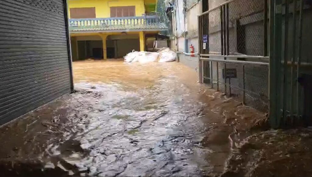 ส่วนที่แม่สาย จ.เชียงราย เช้าวันนี้ แม่น้ำสายเอ่อล้นตลิ่ง เข้าท่วมพื้นที่ตลาดสายลมจอย เขตเทศบาลตำบลแม่สาย อย่างฉับพลัน หลังจากที่มีฝนตลอดทั้งคืน ส่งผลให้ร้านค้าและบ้านเรือนประชาชนในพื้นที่โดยรอบได้รับผลกระทบเป็นวงกว้าง โดยเฉพาะบริเวณตลาดสดและเขตชุมชนลุ่มต่ำ เจ้าหน้าที่ทหารช่างได้เร่งนำกระสอบทรายบิ๊กแบ็คมากั้นด้านบนสะพานมิตรภาพแห่งที่ 1 เพื่อบังคับทิศทางน้ำไม่ให้เข้าท่วมในพื้นที่ชุมชน นอกจากนี้ยังเร่งอุดรูรั่วที่ผนังกำแพงบ้านเรือนประชาชนนที่ติดกับแม่น้ำสาย พร้อมเร่งสูบน้ำระบายออกจากพื้นที่ ส่วนที่ชุมชนเกาะทรายพบการรั่วของกระสอบทรายทำให้น้ำจากแม่น้ำสายทะลักเข้าสู่บริเวณศาลเจ้า และชุมชนไม้ลุงขน ส่งผลให้ระดับน้ำในพื้นที่เพิ่มสูงขึ้นอย่างต่อเนื่อง