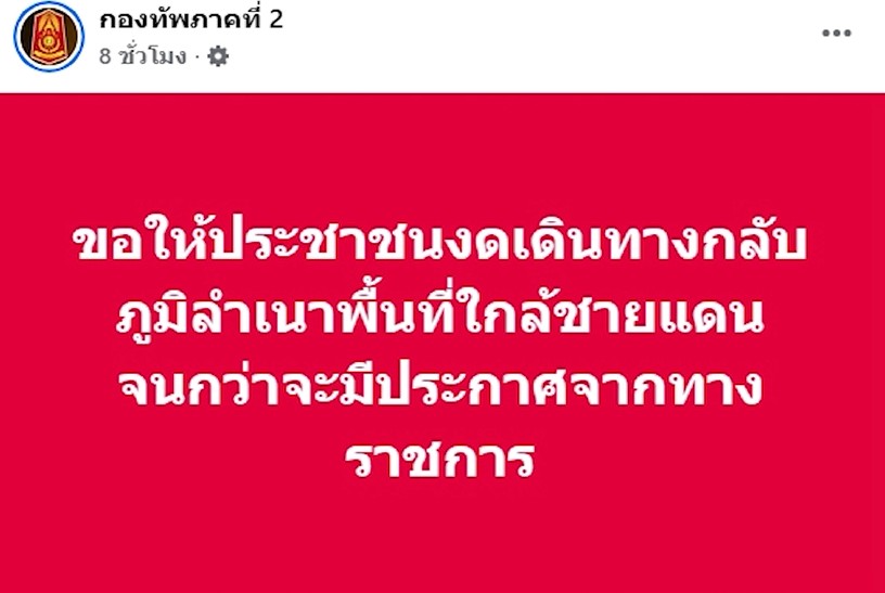 ช่วง 1 ทุ่มกว่า กองทัพภาคที่ 2 โพสต์แจ้งประชาชนขอให้งดเดินทางกลับภูมิลำเนา พื้นที่ใกล้ชายแดน จนกว่าจะมีประกาศจากทางราชการ