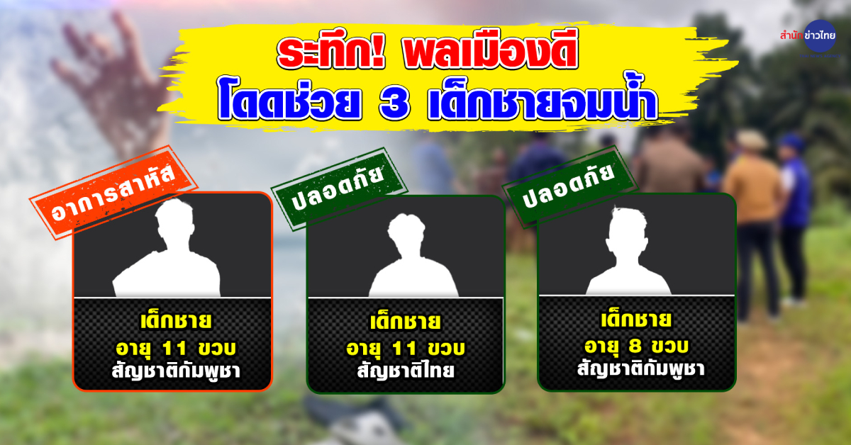 ตราด 30 ก.ค. – เด็กชาย 3 คน จมน้ำในสระของโรงน้ำแข็งแห่งหนึ่ง อ.คลองใหญ่ จ.ตราด พลเมืองดีเห็นกระโดดช่วยไว้ได้รอดหวุดหวิด 2 คน ส่วนอีก 1 คน อาการสาหัส