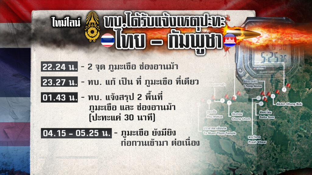 เช้าตรู่มีรายงานจากกองทัพบก โดย พ.อ.ริชฌา สุขสุวานนท์ รองโฆษกกองทัพบก เปิดไทม์ไลน์ให้เห็นชัดๆ ว่าทหารกัมพูชาเปิดฉากโจมตีทหารไทย เริ่มตั้งแต่ช่วงกลางคืนที่ผ่านมา (29 ก.ค.) ประมาณ 22.24 น. มีรายงาน ปะทะ2 จุด คือ ภูมะเขือ และช่องอานม้า