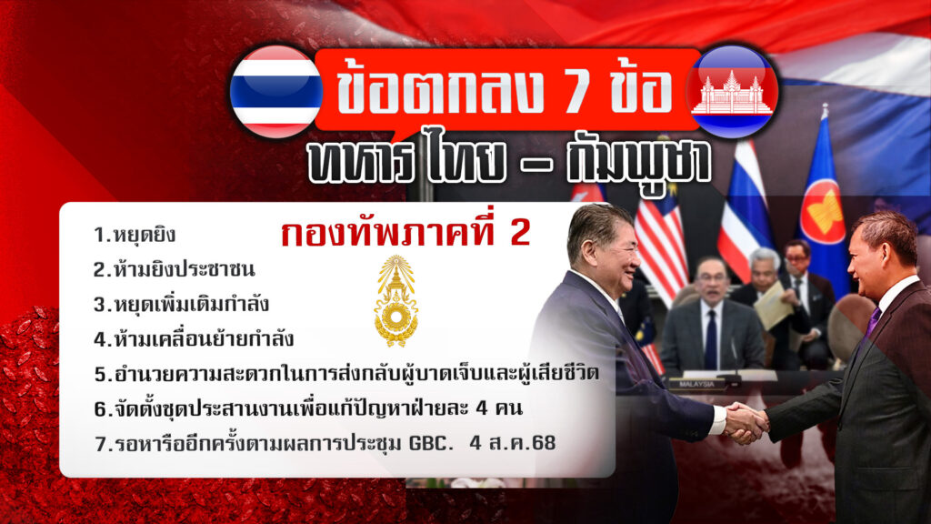 7 ข้อตกลงหยุดยิง ที่เป็นผลจากการหารือระหว่างแม่ทัพภาคที่ 2 กับผู้บัญชาการทหารกัมพูชา เมื่อวานนี้ (29 ก.ค. 68) แต่ผ่านไปไม่กี่ชั่วโมง กัมพูชาก็ไม่ทำตาม ข้อตกลง 7 ข้อ ประกอบด้วย