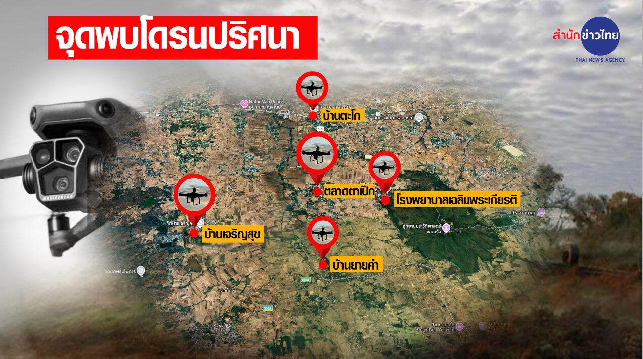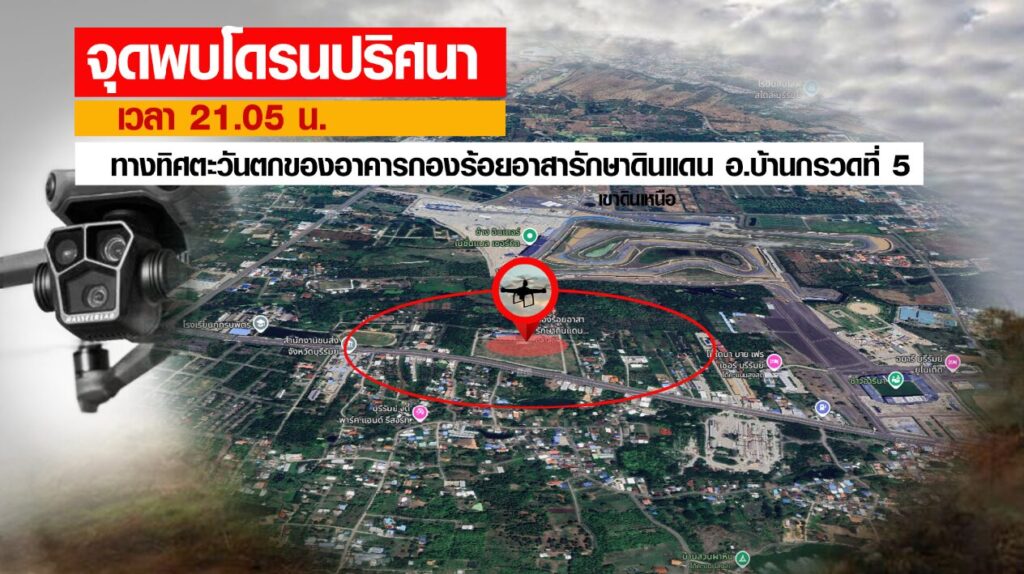 เมื่อเวลาประมาณ 23.00 น. คืนที่ผ่านมา เจ้าหน้าที่หน่วยกู้ภัยสว่างจรรยา จุด อ.เฉลิมพระเกียรติ จ.บุรีรัมย์ ใช้โทรศัพท์บันทึกภาพโดรนที่บินเหนือ รพ.เฉลิมพระเกียรติ ไว้ได้ และยังพบว่ามีโดรนบินเหนือบ้านตะโก, บ้านยายคำ, ตลาดตาเป๊กและบ้านเจริญสุข รวมทั้งหมด 4 แห่ง บินวนเวียนประมาณ 5 นาที จึงพยายามตรวจสอบโดยรอบพื้นที่ ก่อนจะพบรถตู้ยี่ห้อฮุนไดสีดำจอดอยู่ เชื่อว่าน่าจะเป็นเจ้าของโดรน เมื่อเข้าไปสอบถามคนในรถตู้ ที่เปิดกระจกลงมาพูดคุย เห็นภายในรถตู้มีคนประมาณ 3-4 คน มีอุปกรณ์คล้ายเครื่องควบคุมอะไรบางอย่างอยู่ในรถ จึงสอบถามว่าจะไปที่ไหน ได้รับคำตอบว่าจะไปสระแก้ว หลังจากนั้นรถตู้ได้ขับหนีออกไปอย่างรวดเร็ว แม้จะพยายามขับรถไล่ตามแต่ตามไม่ทัน เชื่อว่าเป็นโดรนของกัมพูชามาบินสอดแนมอย่างแน่นอน