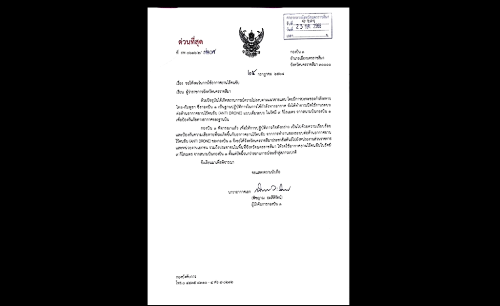 ภายหลังรัฐบาลและกองทัพไทย ประกาศมาตรการควบคุมไม่ให้มีการขึ้นบินอากาศยานไร้คนขับ หรือ โดรน ทั่วประเทศ จนถึงวันที่ 15 สิงหาคม 2568 นั้น รายงานข่าวจากวิทยุการบินแห่งประเทศไทย หรือ บวท. ระบุว่าในส่วนของระบบแอนตี้โดรน ที่มีในขณะนี้ ได้มีการนำมาใช้ในจังหวัดที่ควบคุมด้านความมั่นคงแล้ว แต่ไม่ได้ใช้ระบบแอนตี้โดรนทั่วทั้งประเทศ โดยขอให้ประชาชนเคร่งครัด กับระวังตามประกาศดังกล่าว เพื่อแยกโดรนที่เป็นภัยต่อความความมั่นคงออกไป ย้ำว่าหากยังมีการฝ่าฝืน ฝ่ายความมั่นคงจะใช้มาตรการทางการทหาร นำโดรนลำนั้นลงทันที