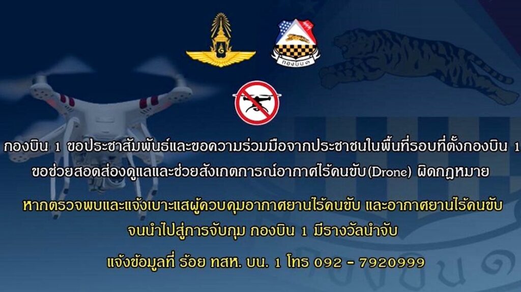 ขณะเดียวกัน กองบิน 1 นครราชสีมา ยังได้โพสต์ภาพผ่านเพจเฟซบุ๊ก “กองบิน 1 Home of the Tiger” มีข้อความว่า “กองบิน 1 ขอประชาสัมพันธ์และขอความร่วมมือจากประชาชนในพื้นที่รอบที่ตั้งกองบิน 1 ขอให้ช่วยสอดส่องดูแลและช่วยสังเกตการณ์อากาศยานไร้คนขับ (Drone) ผิดกฎหมาย หากตรวจพบและแจ้งเบาะแสผู้ควบคุมอากาศยานไร้คนขับและอากาศยานไร้คนขับ จนนำไปสู่การจับกุม กองบิน 1 มีรางวัลนำจับ แจ้งข้อมูลที่ ร้อย ทสห.บน.1 โทร.092-7920999”.-สำนักข่าวไทย