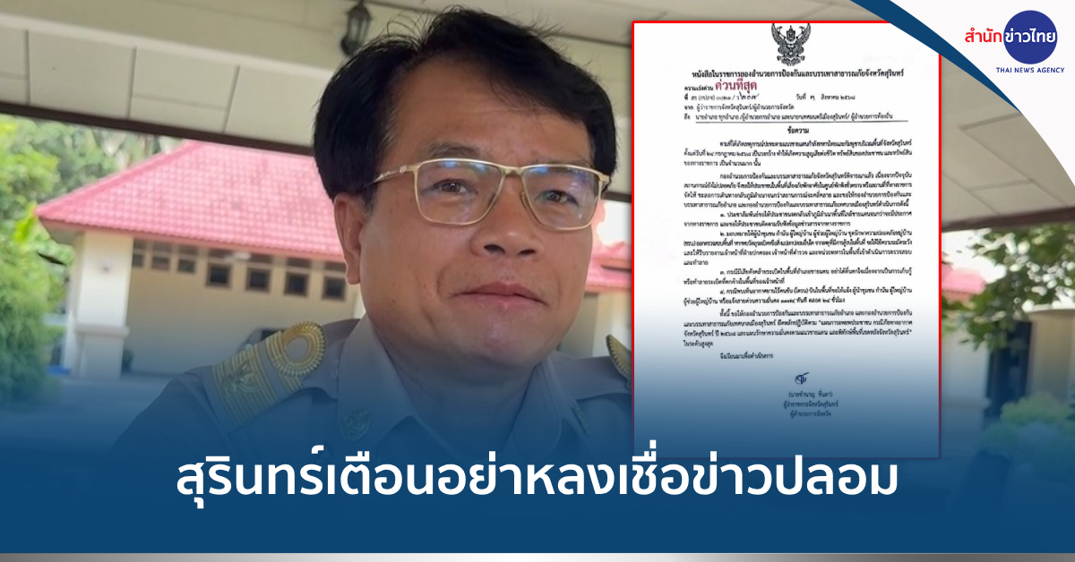สุรินทร์ 3 ส.ค. – ผู้ว่าฯ สุรินทร์ ทำหนังสือด่วนที่สุดถึงนายอำเภอและผู้นำชุมชนใน จ.สสุรินทร์ เพื่อป้องกันข่าวปลอม ที่สร้างความตื่นตระหนกให้กับประชาชน หลังจากมีผู้ไม่หวังดีแชร์ข้อมูลจนทำให้ชาวบ้านเข้าใจผิดและเกิดความวุ่นวายในจังหวัด