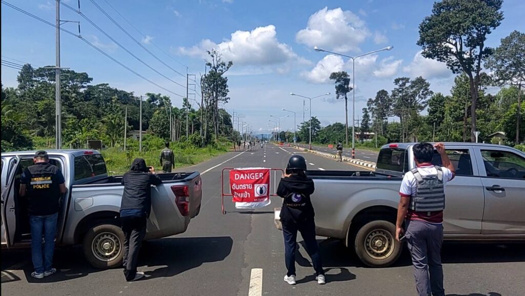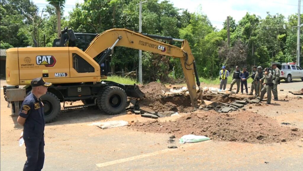 ศรีสะเกษ 4 ส.ค. – เจ้าหน้าที่อีโอดีเก็บกู้จรวด BM 21 ที่กัมพูชายิงเข้ามาตกและฝังอยู่ในพื้นถนนกันทรลักษ์อีกจุด ใกล้กับปั๊มน้ำมันที่ถูกกัมพูชายิงใส่วันที่ 24 ก.ค. เช่นเดียวกัน