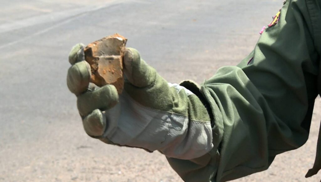 เจ้าหน้าที่ ยังนำชิ้นส่วนหัวจรวดบีเอ็ม 21 ที่เก็บกู้เสร็จแล้วมาให้ทีมข่าวดูโดยบอกว่าเป็นส่วนหัวเนื่องจากจะมีลักษณะร่องที่แตกต่างจากชิ้นส่วนอื่นๆและจะเป็นชิ้นส่วนที่หนากว่าส่วนอื่นๆ พร้อมยืนยันว่าจุดที่ระเบิดลงบนถนนทั้งสองแห่งรวมไปถึงปั๊ม ปตท. เป็นแนวยิงของ BM 21 จากกัมพูชา.-สำนักข่าวไทย