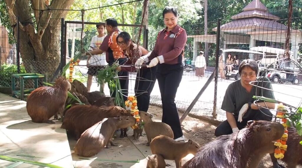โดยพวงมาลัยอาหารสัตว์ที่จัดทำขึ้นในครั้งนี้ ผลิตจากอาหารธรรมชาติที่คาปิบาราชื่นชอบ ได้แก่ แครอท กล้วย ข้าวโพด และหญ้าเนเปียร์ นำมาจัดเรียงในรูปแบบพวงมาลัย เพื่อกระตุ้นพฤติกรรมตามธรรมชาติของสัตว์ เช่น การดมกลิ่น การแทะ และการค้นหาอาหาร