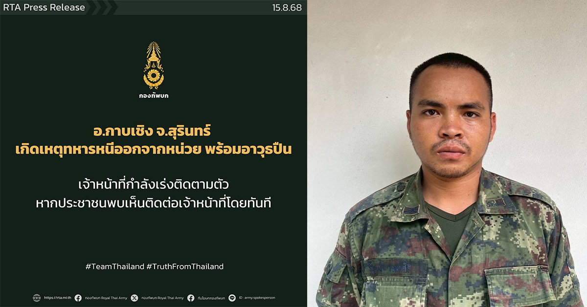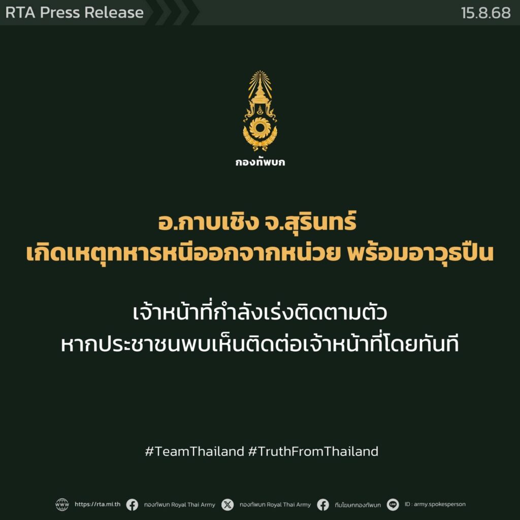 15 ส.ค.- กองทัพบกแจงเหตุทหารหนีออกจากหน่วยพร้อมอาวุธปืน รัวยิงกลางดึก ชาวบ้านกาบเชิง เจ็บ 2 ราย จนท.เร่งล่า ยังไม่พบตัว หากประชาชนพบเห็นรีบแจ้งทันที