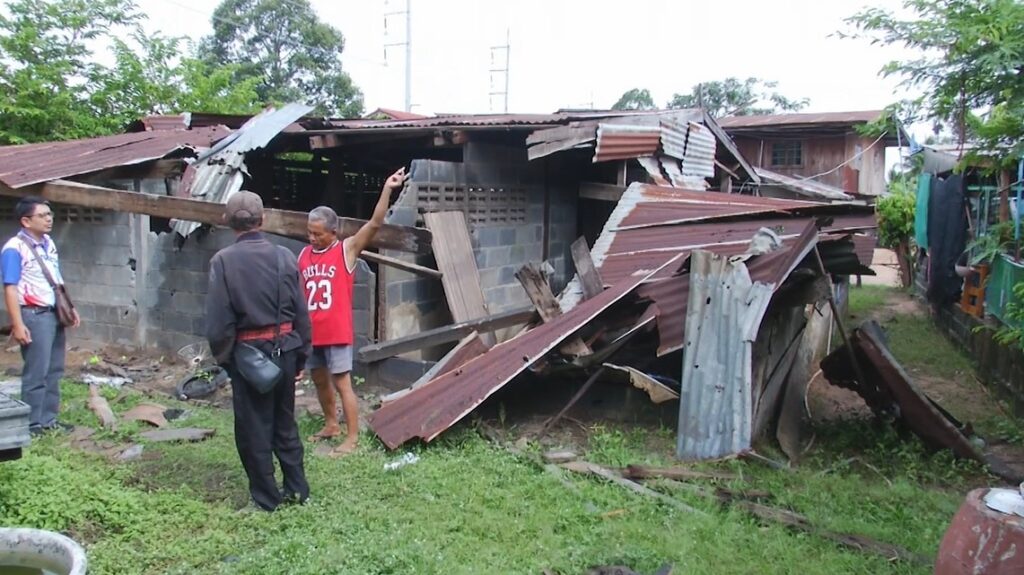 สภาพความเสียหายของบ้านเรือนประชาชนติดกัน 2 หลัง ในหมู่บ้านหนองเม็ก ต.เสาธงชัย อ.กันทรลักษ์ จ.ศรีสะเกษ ที่ถูกกระสุนจรวด BM-21 ตกใส่เมื่อช่วงเย็นวันที่ 27 กรกฎาคมที่ผ่านมา ส่งผลให้มีผู้เสียชีวิต 1 ราย และบาดเจ็บอีก 1 ราย โดยกระสุนพุ่งโดนเสา ทิศทางระเบิดขึ้นบนฟ้า หากตกดินและกระจายในแนวราบ สะเก็ดจะถูกญาติอีก 2 คนที่หมอบอยู่ไม่ไกล ได้รับความเสียหายเพิ่มเติม โดยเวลานั้นพากันออกมาจากหลุมหลบภัยเพื่อหุงหาอาหารค่ำ เพราะเห็นว่าเสียงปะทะเงียบแล้ว แต่จู่ๆ มีจรวด BM-21 ตกใส่แบบไม่ทันตั้งตัว เป็นหลักฐานที่ยืนยันได้ชัดเจนว่ากัมพูชาตั้งใจโจมตีเป้าหมายพลเรือน ละเมิดกฎหมายระหว่างประเทศ ซึ่งพรุ่งนี้ (16 ส.ค.) คณะทูตจากประเทศภาคีอนุสัญญาออตตาวา จะเข้ามาตรวจสอบความเสียหายในจุดนี้ด้วย โดยชาวบ้านที่รอดจากสะเก็ดระเบิดหวุดหวิด ชี้ว่ากัมพูชาใช้วิธีการรบนอกแบบมาตลอด และไม่เคยเคารพกติกาใดๆ