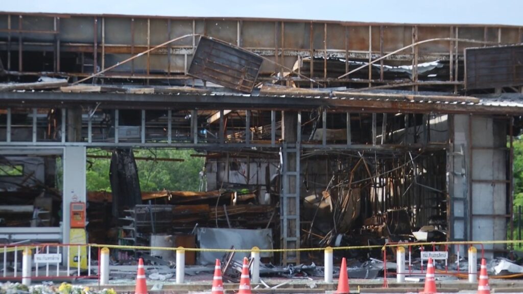 ร้านสะดวกซื้อที่เสียหายอย่างหนัก ภายในปั๊มน้ำมัน ปตท.บ้านผือ ใกล้ตัว อ.กันทรลักษ์ เป็นอีกจุดที่คณะทูต จะไปตรวจสอบด้วย โดยจุดนี้มีผู้เสียชีวิตถึง 8 ราย บาดเจ็บอีก 10 ราย หลังถูกโจมตีไม่เลือกในวันเปิดฉากปะทะกันวันแรก 24 กรกฎาคมที่ผ่านมา