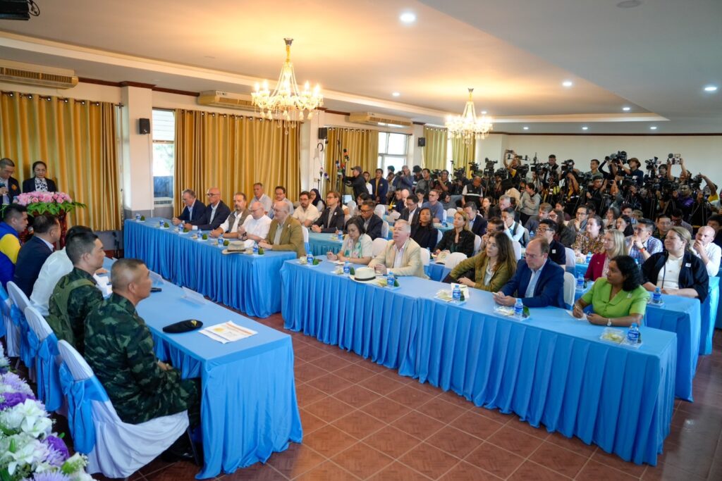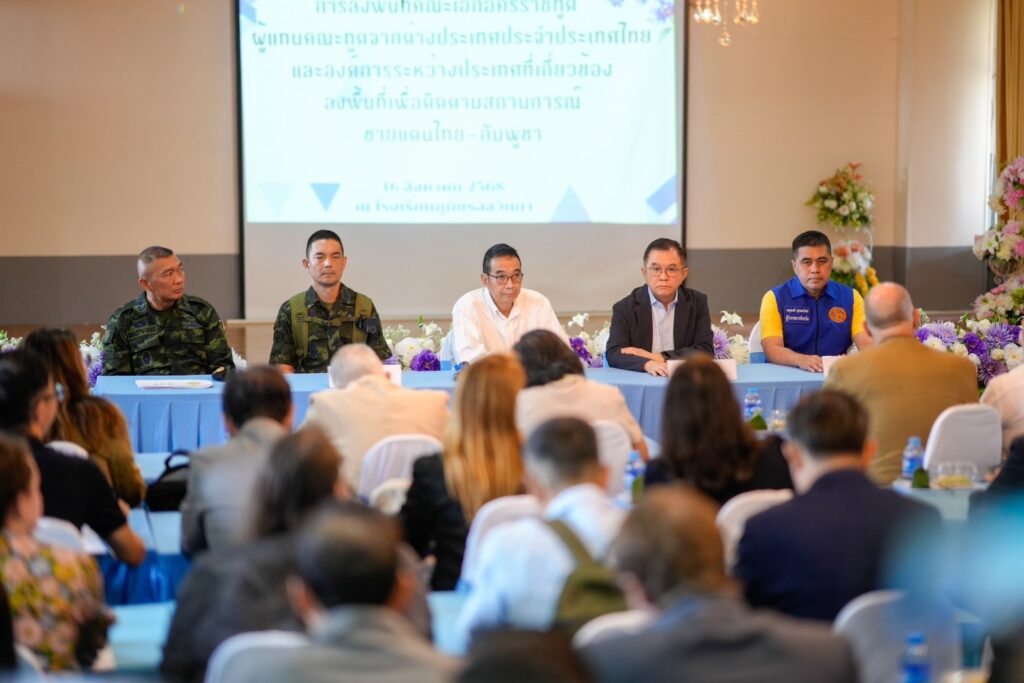 ศรีสะเกษ 16 ส.ค. – กต. นำทูต 33 ประเทศ บรรยายสรุปปัญหาการใช้ทุ่นระเบิดจากฝ่ายกัมพูชา ชี้ไม่สนว่าเป็นของเก่าหรือไม่ พร้อมประสานประชาคมโลกกดดันเขมรร่วมเก็บกู้ ด้านชาวบ้านในพื้นที่เผยบาดเจ็บจนขาขาดตั้งแต่ 30 ปีที่แล้ว ขณะที่คณะทูตให้ความสนใจสอบถามความเป็นอยู่-สาเหตุ ด้าน “มาริษ” ลั่นรัฐบาลจะไม่ปล่อยให้เกิดอีก