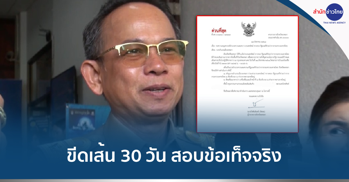สงขลา 19 ส.ค. – ผู้ว่าฯ สงขลา สั่งตั้งคณะกรรมการตรวจสอบข้อเท็จจริง กรณีหนังสือราชการมีลายเซ็นผู้ว่าฯ ลงนามถึงนายอำเภอเมืองสงขลา ขอความอนุเคราะห์อำนวยความสะดวก “เดชอิศม์” ขีดเส้นแล้วเสร็จใน 30 วัน