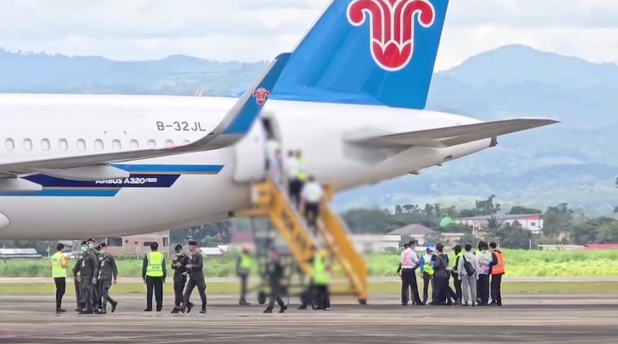 เจ้าหน้าที่ฝ่ายความมั่นคงจังหวัดเมียวดี เมียนมา นำตัวชาวจีน 94 คน แก๊งคอลเซ็นเตอร์ลอตพิเศษที่ถูกกวาดล้างครั้งล่าสุด ข้ามด่านพรมแดนถาวรเมียวดี-แม่สอด แห่งที่ 2 อ.แม่สอด จ.ตาก มาส่งให้เจ้าหน้าที่ระดับสูงของจีน ซึ่งมารอรับตัวที่ฝั่งไทย โดยผ่านขั้นตอน ตม.ไทย ตรวจสอบอย่างละเอียด ก่อนจัดขบวนรถคุ้มกันและนำชาวจีนทั้งหมดไปยังท่าอากาศยานนานาชาติแม่สอด เพื่อขึ้นเครื่องบินเหมาลำของทางการจีน จำนวน 2 ลำ ท่ามกลางการรักษาความปลอดภัยอย่างเข้มงวด