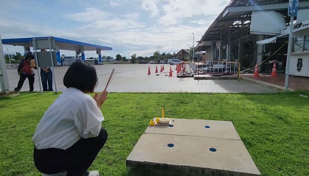 ก่อนเริ่มรื้อถอน นางกมลรัตน์ พลเศรษฐเลิศ เจ้าของปั๊มน้ำมันได้จุดธูปและนำพวงมาลัยมาไหว้เจ้าที่บอกกล่าวสิ่งศักดิ์สิทธิ์ พร้อมจุดธูปบอกกล่าวดวงวิญญาณทั้ง 7 คนที่เสียชีวิตในร้านสะดวกซื้อแห่งนี้