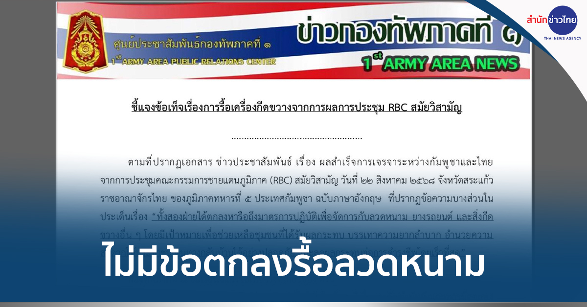 ตามที่ปรากฏเอกสาร ข่าวประชาสัมพันธ์ เรื่อง ผลสำเร็จการเจรจาระหว่างกัมพูชาและไทย จากการประชุมคณะกรรมการชายแดนภูมิภาค (RBC) สมัยวิสามัญ วันที่ 22 สิงหาคม 2568 จังหวัดสระแก้ว ราชอาณาจักรไทย ของภูมิภาคทหารที่ 5 ประเทศกัมพูชา ฉบับภาษาอังกฤษ ที่ปรากฏข้อความบางส่วนในประเด็นเรื่อง “ทั้งสองฝ่ายได้ตกลงหารือถึงมาตรการปฏิบัติเพื่อจัดการกับลวดหนาม ยางรถยนต์ และสิ่งกีดขวางอื่น ๆ โดยมีเป้าหมายเพื่อช่วยเหลือชุมชนที่ได้รับผลกระทบ บรรเทาความยากลำบาก อำนวยความสะดวกให้ประชาชนเดินทางกลับบ้านได้อย่างปลอดภัย และลดผลกระทบต่อการดำรงชีพโดยเร็วที่สุด”
