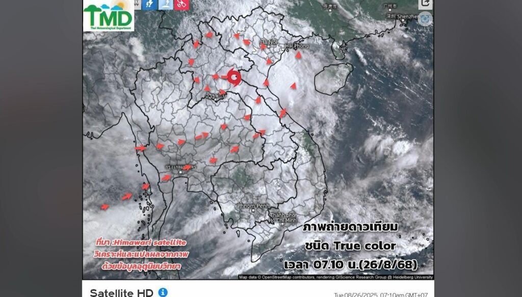 พายุไต้ฝุ่น “คาจิกิ” อ่อนกำลังลงเป็นพายุโซนร้อนแล้ว ขณะนี้มีศูนย์กลางอยู่บริเวณแขวงบอลิคำไซ ประเทศลาว ศูนย์กลางอยู่ห่างจาก จ.บึงกาฬ ไปทางเหนือราว 40 กิโลเมตร และยังคงเคลื่อนตัวไปทางทิศตะวันตก คาดว่าจะอ่อนกำลังลงเป็นพายุดีเปรสชัน และกลายเป็นหย่อมความกดอากาศต่ำกำลังแรง เมื่อศูนย์กลางเคลื่อนเข้าปกคลุมภาคเหนือของไทย ขณะนี้เส้นทางจะเข้าทาง จ.น่าน ในช่วงเย็นถึงค่ำนี้ (26 ส.ค.)