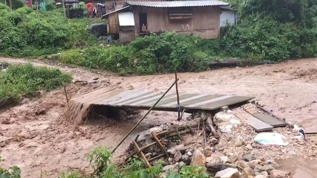 ขณะที่ จ.แม่ฮ่องสอน มีผู้ใช้โซเชียลโพสต์คลิปสถานการณ์น้ำป่าไหลหลากอย่างรุนแรงช่วงบ่ายวานนี้ (26 ส.ค.) ในพื้นที่บ้านแม่โกปี๋ ต.แม่ยวมน้อย อ.ขุนยวม จ.แม่ฮ่องสอน พร้อมข้อความว่า พายุเข้าฝนตกหนักอีกแล้ว คนบ้านติดริมน้ำเฝ้าระวังน้ำป่าหลากกันด้วย ขณะที่ผู้ปกครองนักเรียนรีบมารับลูกหลานกลับบ้านท่ามกลางฝนที่ตกหนัก จากบ้านจะเห็นว่าต้องเดินข้ามสะพานไม้ที่มีสายน้ำเชี่ยวกรากอยู่ด้านล่างสะพาน